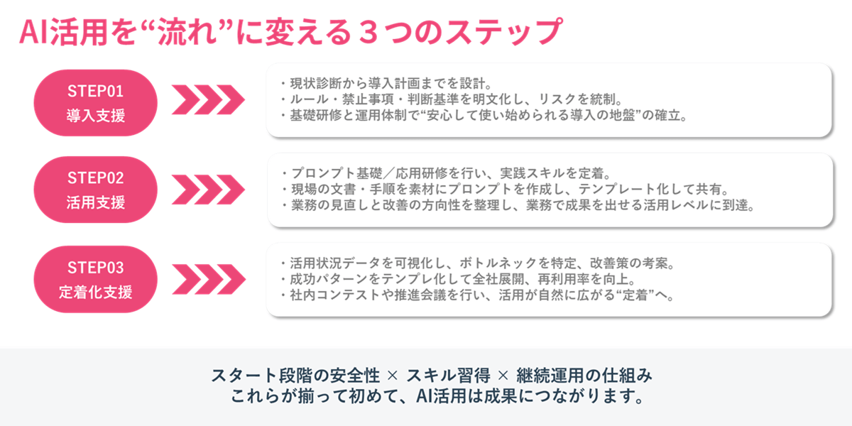 生成AIを企業活動に根付かせることを目的として、3ステップで段階的に支援する伴走型サービスです。安心して導入できる環境整備から、プロンプト活用、定着化までを一気通貫で実現します。